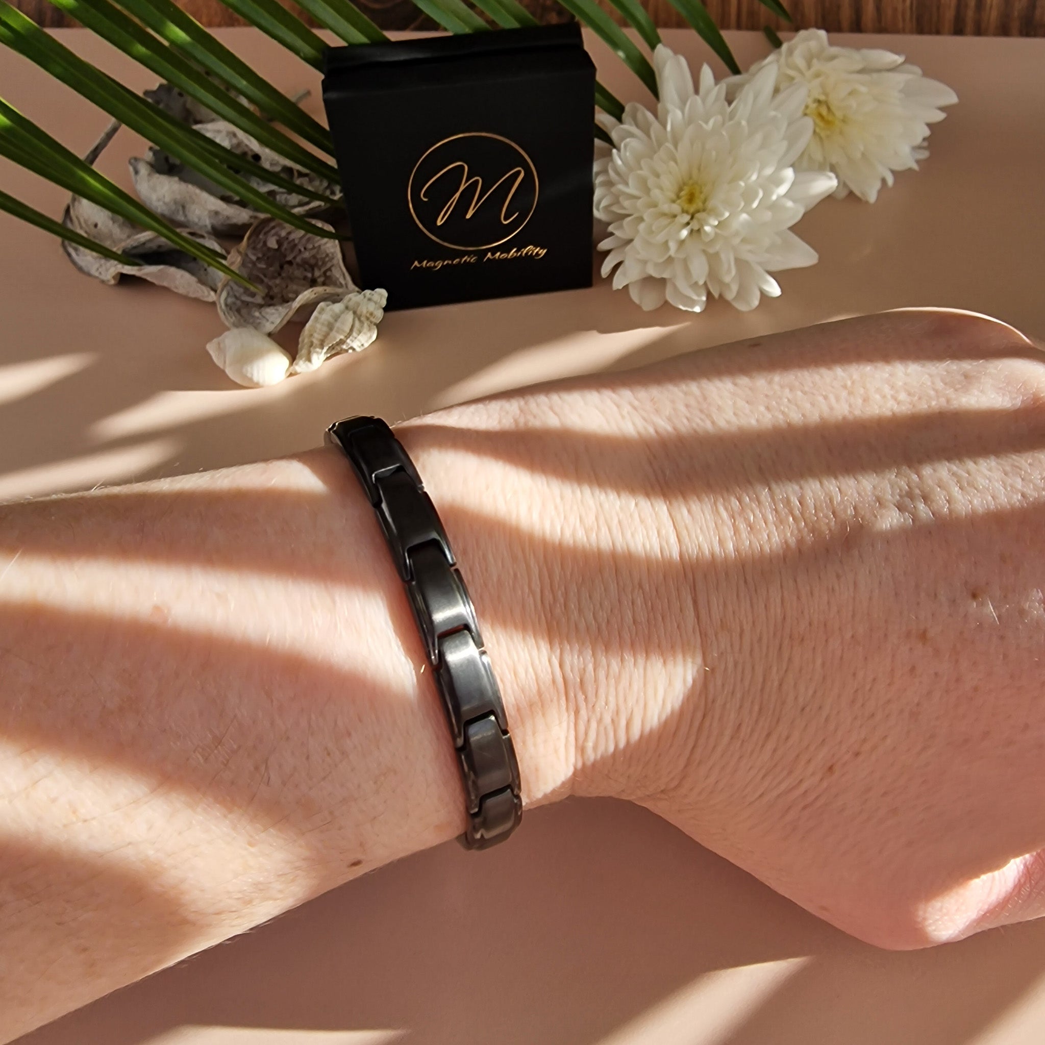 Introducing the Apia Night, a sleek and sophisticated 4in1 Magnetic Bracelet that exudes elegance and functionality. Crafted from high-quality stainless steel, this unisex bracelet features a simple yet striking design of plain links in a bold black colour. With a band width of 7mm, it's a statement piece that doesn't scream for attention but subtly enhances your style.