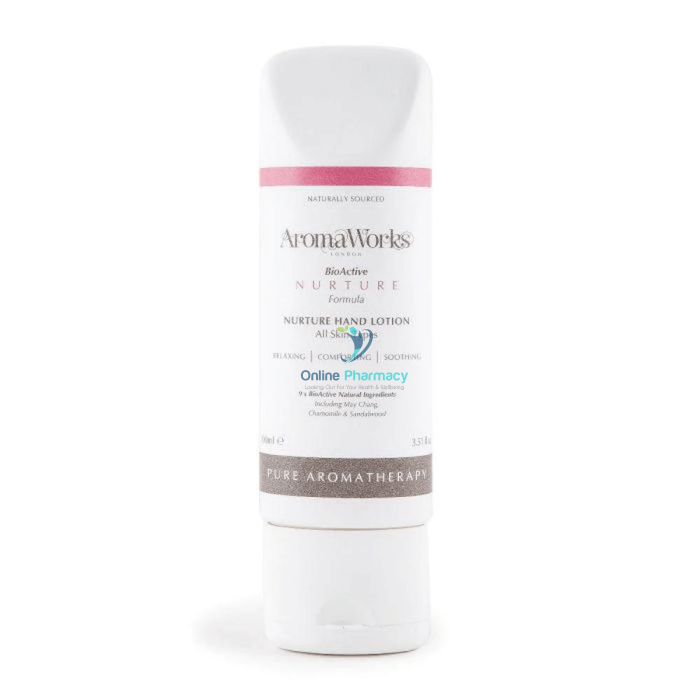Aroma Works Nurture Moisturizing Hand Cream contains 12 bioactive natural ingredients including Actimoist Plus, aloe vera, neroli, & chamomile to form a relaxing and soothing hand lotion. Use as often as you'd like for hydrating dry skin.