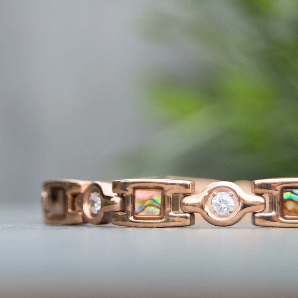 Crafted from high-quality stainless steel and finished in a beautiful rose gold, Avens Dawn is more than just a fashion statement. It's designed for people dealing with arthritis, back pain, migraines, fibromyalgia, and general aches and pains. The bracelet incorporates a sophisticated blend of four elements: Neodymium Magnets, Far Infrared (FIR), Germanium, and Negative Ions. Each element contributes to the bracelet's unique properties, further details of which can be found below.