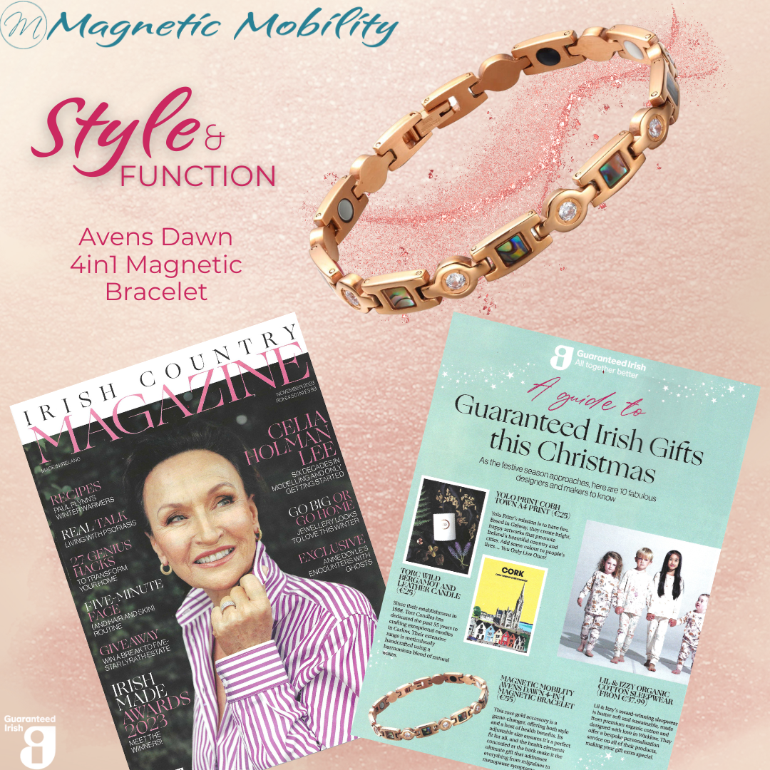 Introducing Avens Dawn, a stunning 4in1 Magnetic Bracelet designed specifically for women. This exquisite bracelet, featured in the Irish Country Magazine's "Guaranteed Irish Gifts this Christmas" November 2023 edition, combines elegance with functionality.