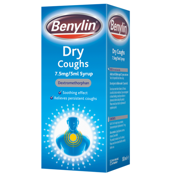 Benylin Dry Cough Non Drowsy gives symptomatic relief to suppress an irritating cough or cough mechanism that causes a dry cough. Benylin’s formulation starts working the moment you swallow, to soothe and ease your throat.