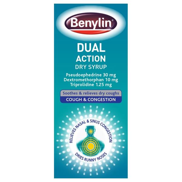 Benylin Dual Action Dry contains triprolidine hydrochloride which is an antihistamine that helps stop sneezing, runny nose and watery eyes, pseudoephedrine hydrochloride which is a decongestant that unblocks stuffy noses and dextromethorphan hydrobromide which is an antitussive to help stop coughing. The medicine is for use in adults and children aged 12 years and over.
