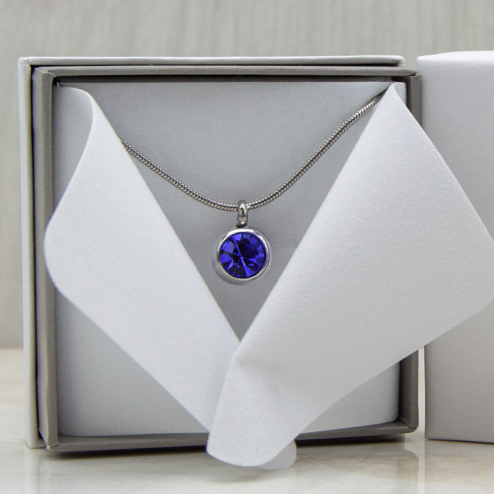 September: Swarovski blue Sapphire. The September birthstone is considered a protective gemstone. It is thought to shield the wearer from physical harm as well as bad intentions and envy.