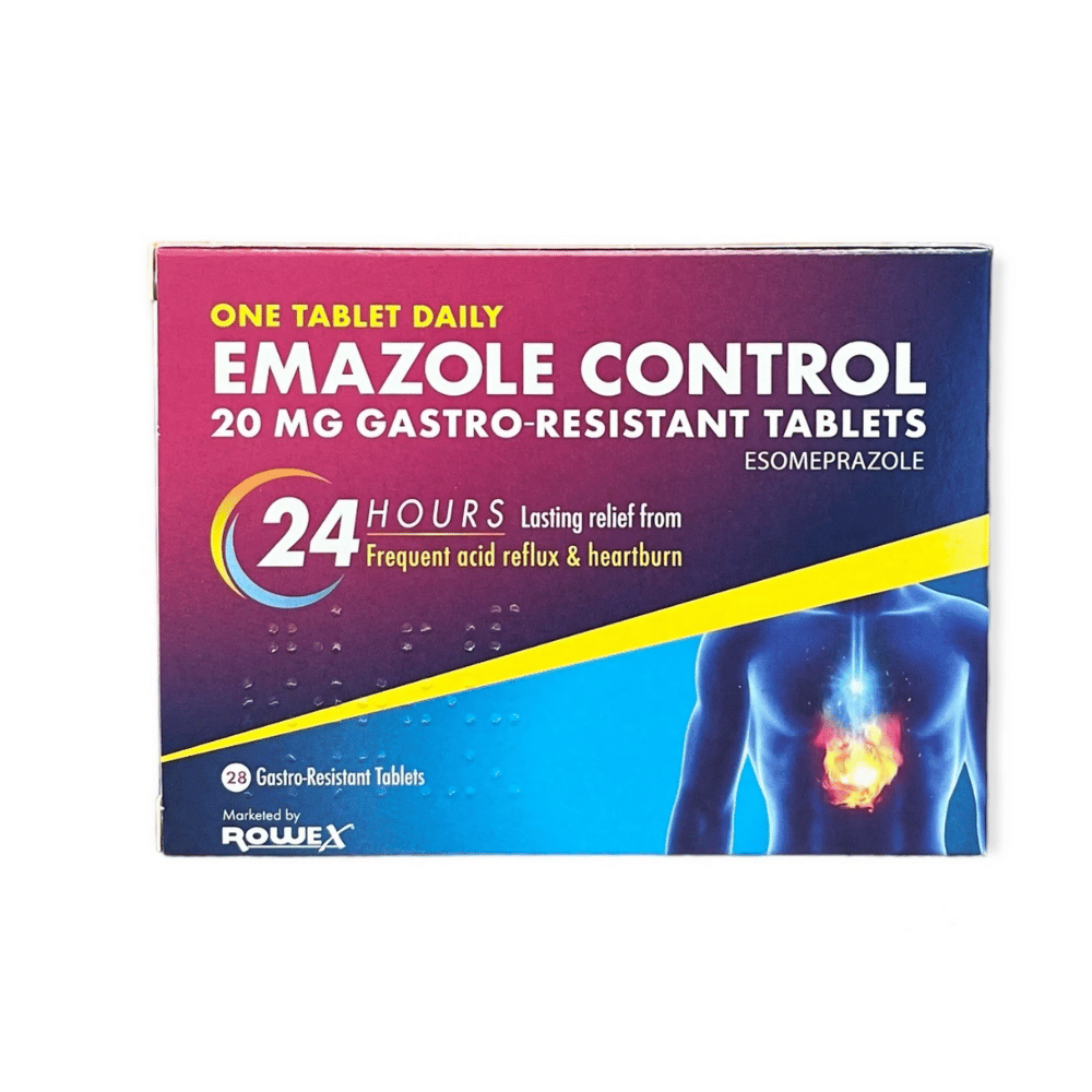Emazole Control 20mg Gastro-Resistant Tablets (28 Pack) are a non-prescription treatment for frequent heartburn and acid reflux, offering up to 24-hour relief with just one tablet a day.