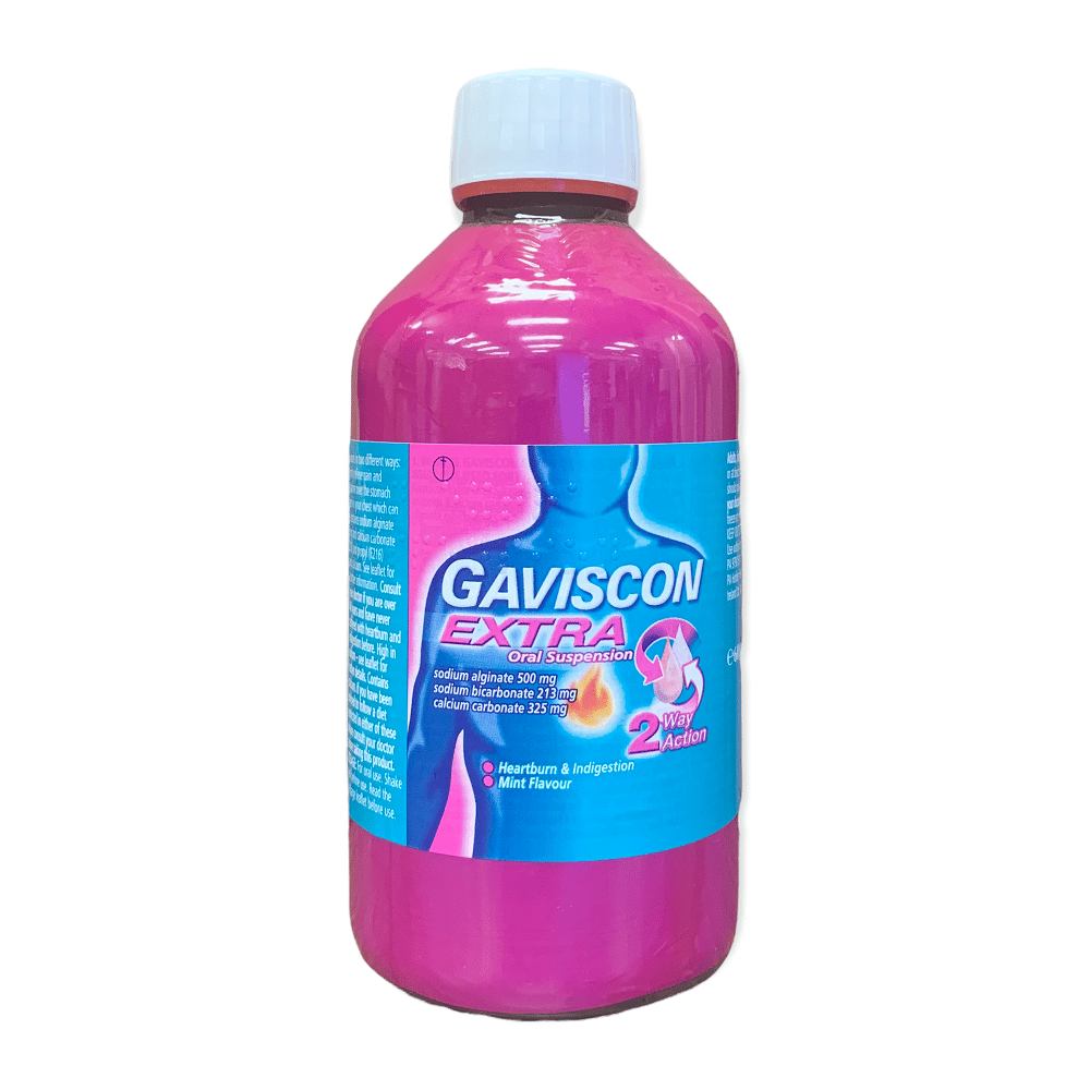 - Gaviscon Extra Oral Suspension is an of-white to cream suspension with a peppermint flavour. Each 10ml oral suspension contains 500mg Sodium Alginate, 213mg Sodium Bicarbonate and 325mg Calcium carbonate. This medicine is used for the treatment of acid related symptoms of gastrooesophageal reflux such as acid regurgitation, heartburn and indigestion, for example, following meals, or during pregnancy. It works in 2 ways: a combination of two antacids to neutralise excess stomach acid, and an alginate which forms a protective layer that floats on top of the stomach contents, keeping it away from the lining of the food pipe.