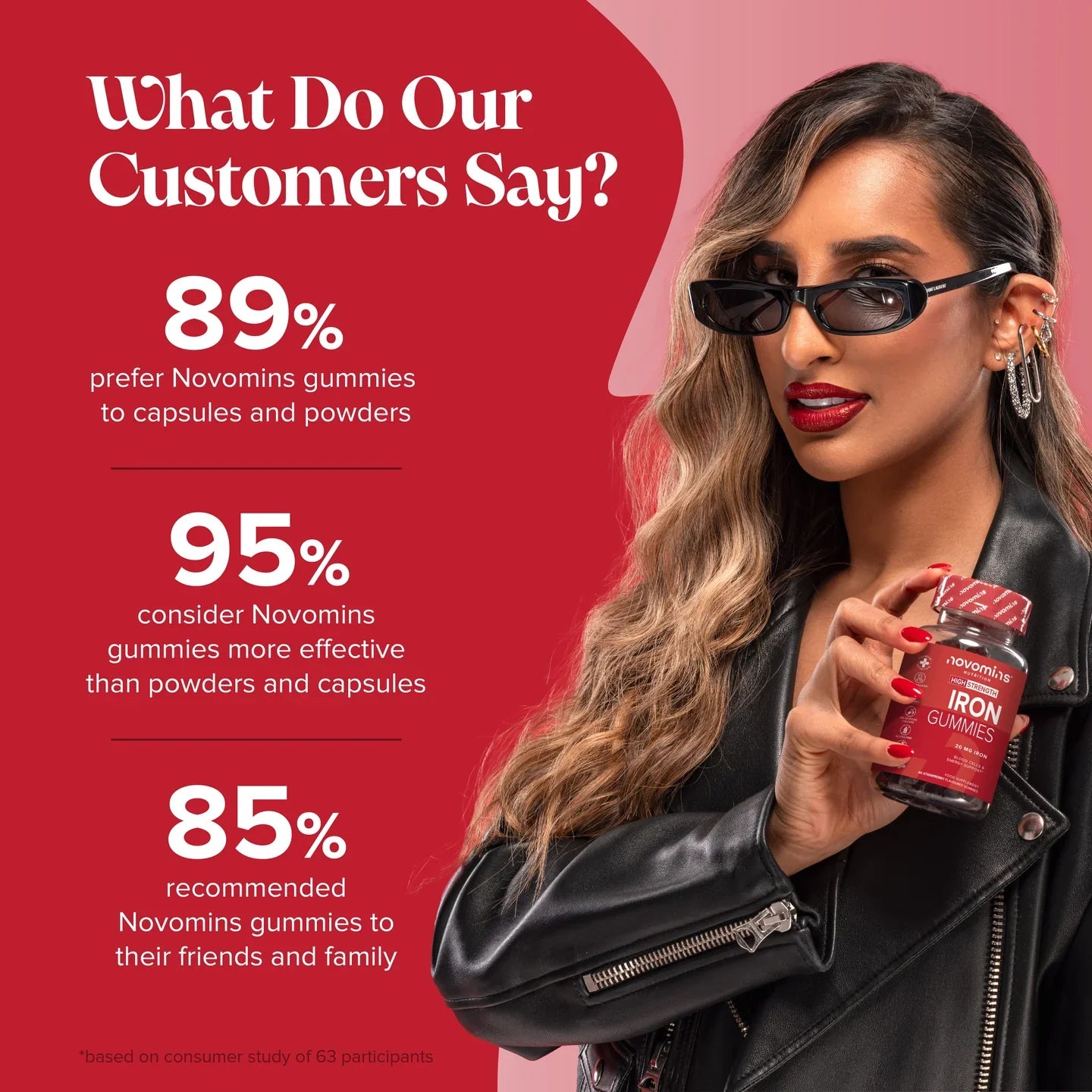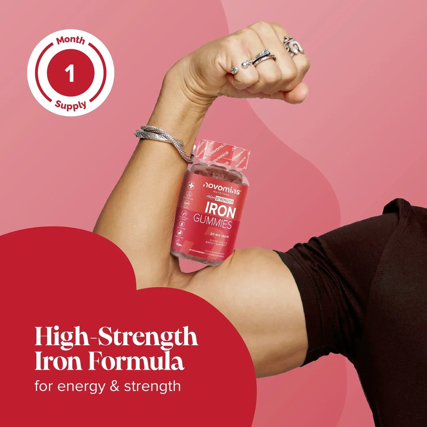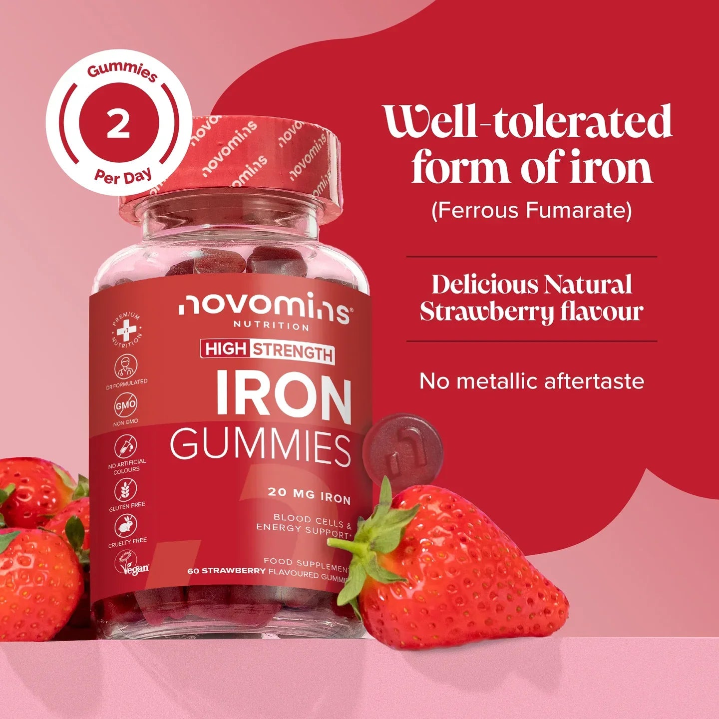 Novomins delicious, easy to chew, strawberry-favoured Iron Gummies are designed to keep your iron levels topped up and provide a much-needed boost to your body. Recharge and reinforce your energy levels today!
