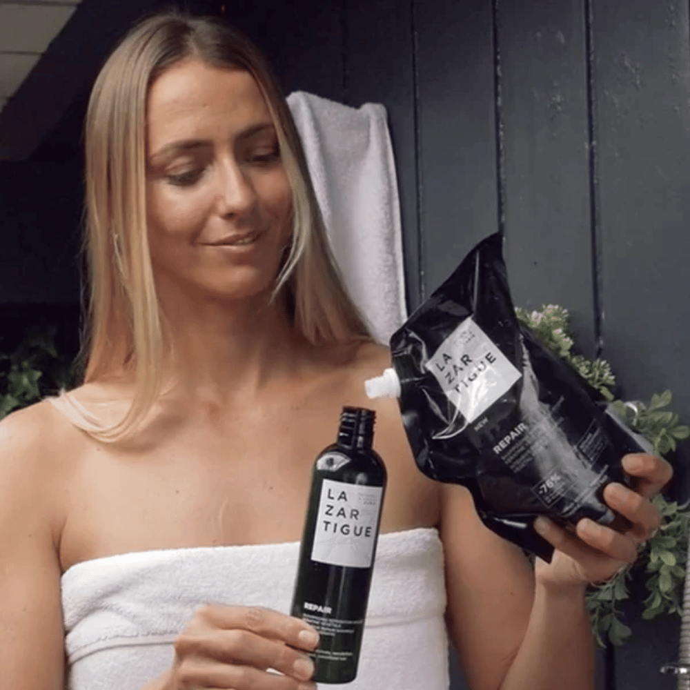 In a 500ml refill format, eco-designed and economical, Repair shampoo repairs damaged hair. Its formula, with 91% natural ingredients, penetrates to the heart of the hair and scalp to restructure damaged keratin fibres. Gently cleansed, hair is repaired, stronger, softer and silkier.