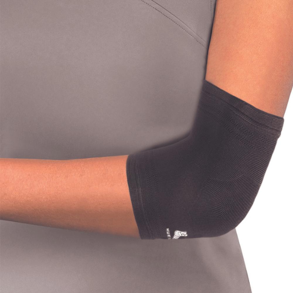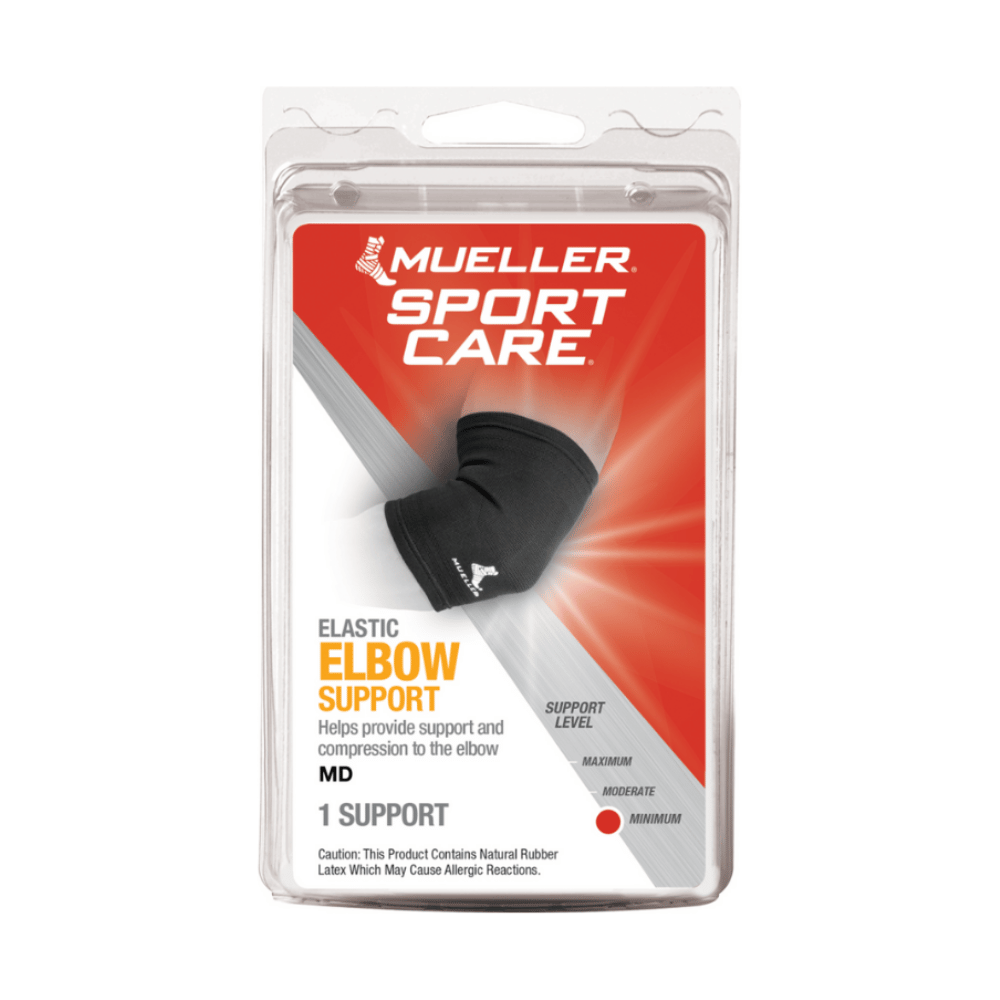 The Mueller Elastic Elbow Support is a custom top knit that helps to prevent rolling and has reinforced trimmed edges that improve durability. The lightweight elastic knit provides firm support and maintains a full range of movement. The support helps to provide support and compression to the elbow.
