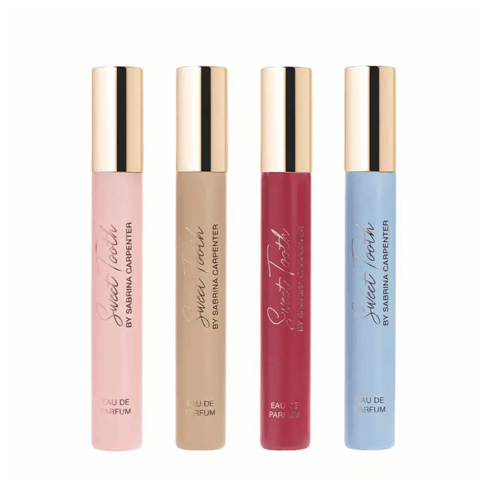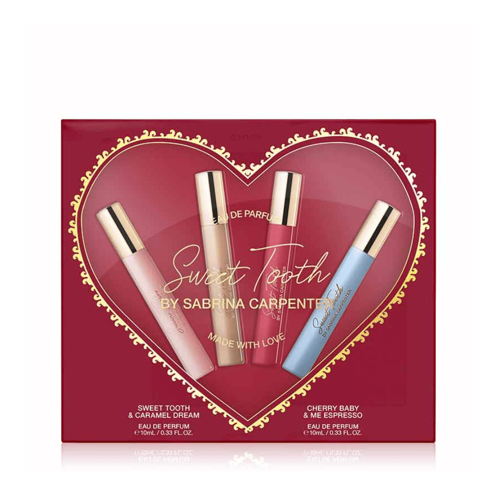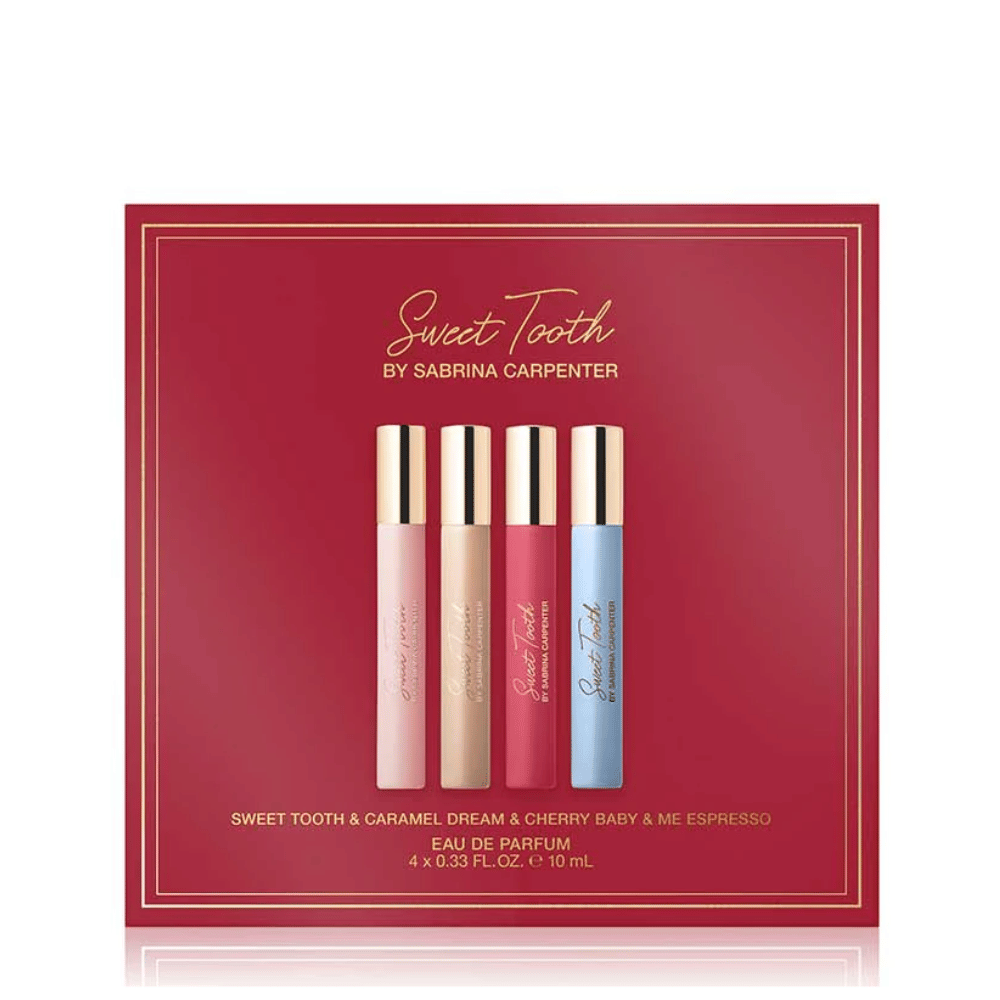 Discover the perfect on-the-go fragrance collection with the Sabrina Carpenter Travel Eau De Parfum Gift Set. This set includes four travel-sized favourites, Sweet Tooth, Cherry Baby, Caramel Dream, and Me Espresso, making it easy to switch scents wherever you are. Perfectly packaged, this Sabrina Carpenter gift set makes a thoughtful gift for fans of Sabrina Carpenter or anyone who loves playful, unique fragrances.