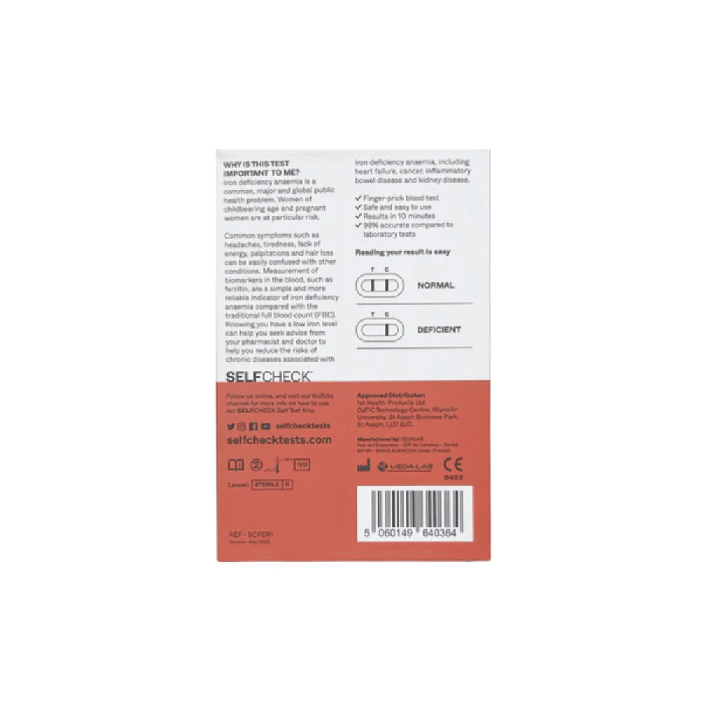 The SELFCHECK Iron Deficiency Test is easy to use, requiring a small finger prick blood sample to perform the test and a visual result is available in less than 10 minutes.